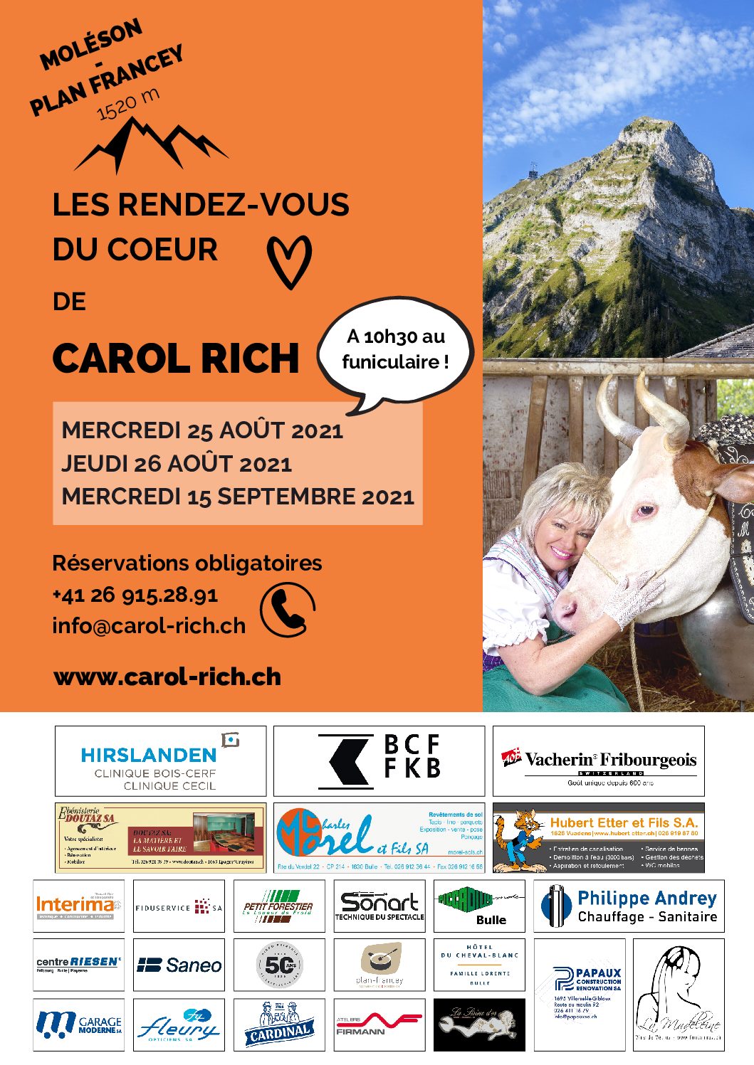 Nous sommes heureux de vous proposer 3 dates pour cet été 2021.Notre équipe vous accueillera à 10h30 au funiculaire de Moléson-Village. Un verre de l’amitié offert par la Cave de la Madeleine à Vétroz vous sera servi lors de votre arrivée au Gîte de Plan Francey en guise de bienvenue à notre journée repas-concert à l’extérieur.